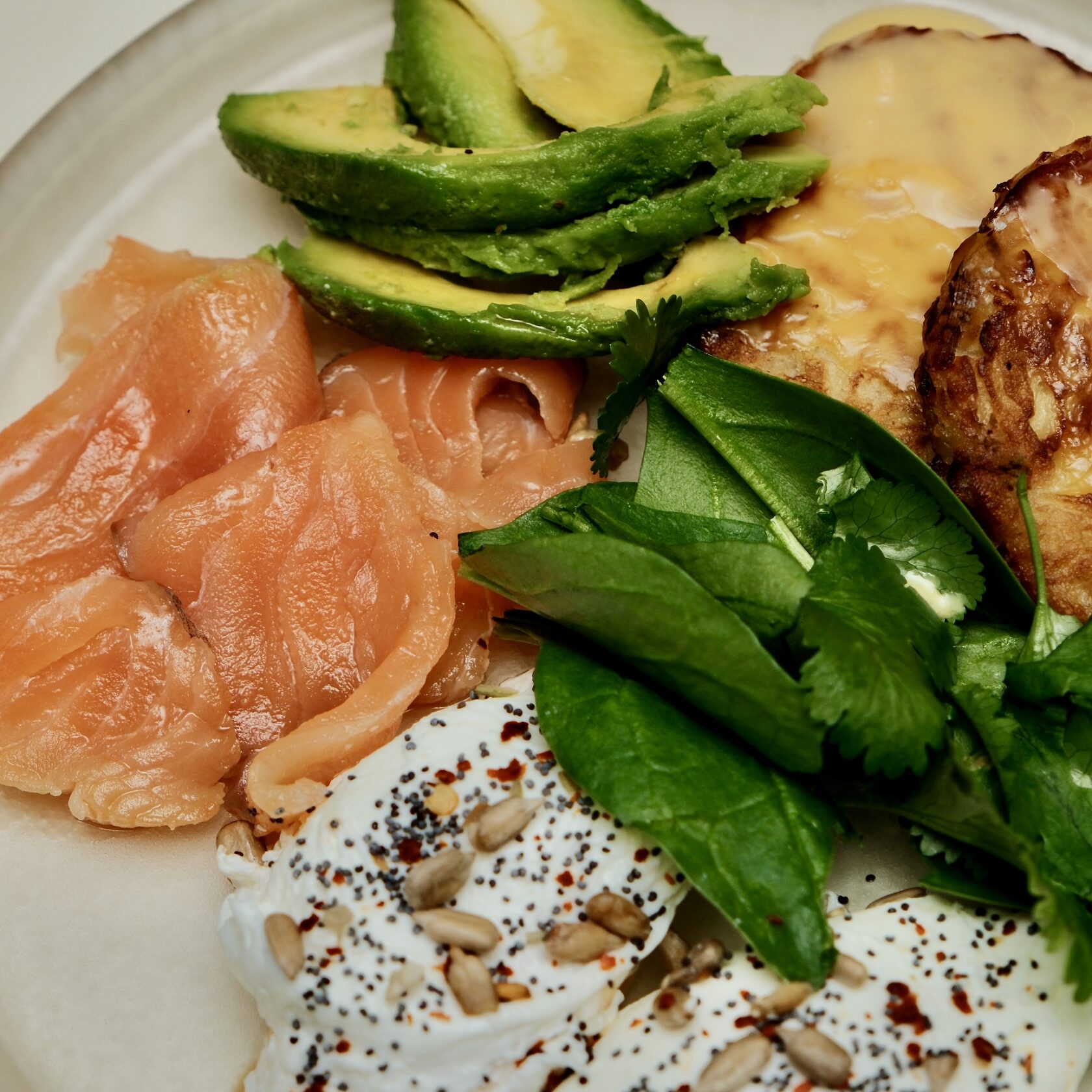 Хрустящие картофельные драники, яйцо пашот, слабосолёная сёмга, шпинат, спелый авокадо и соус голандез.