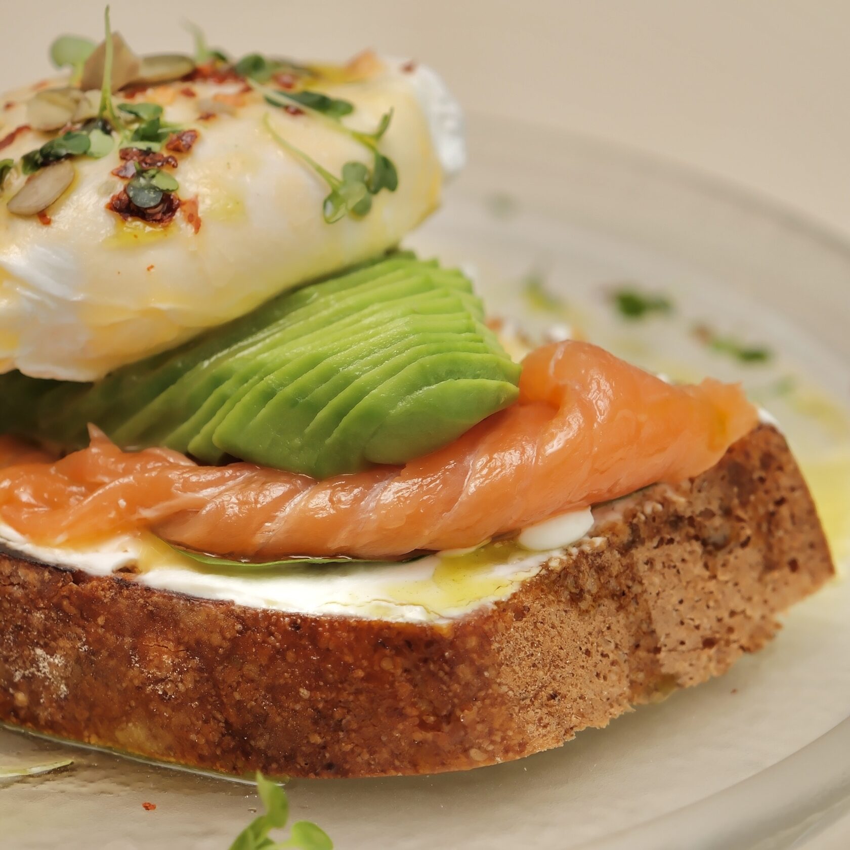 Бездрожжевой тост, обжаренный на сливочном масле, творожный сыр, шпинат, семга, авокадо, яйцо пашот, голландский соус.