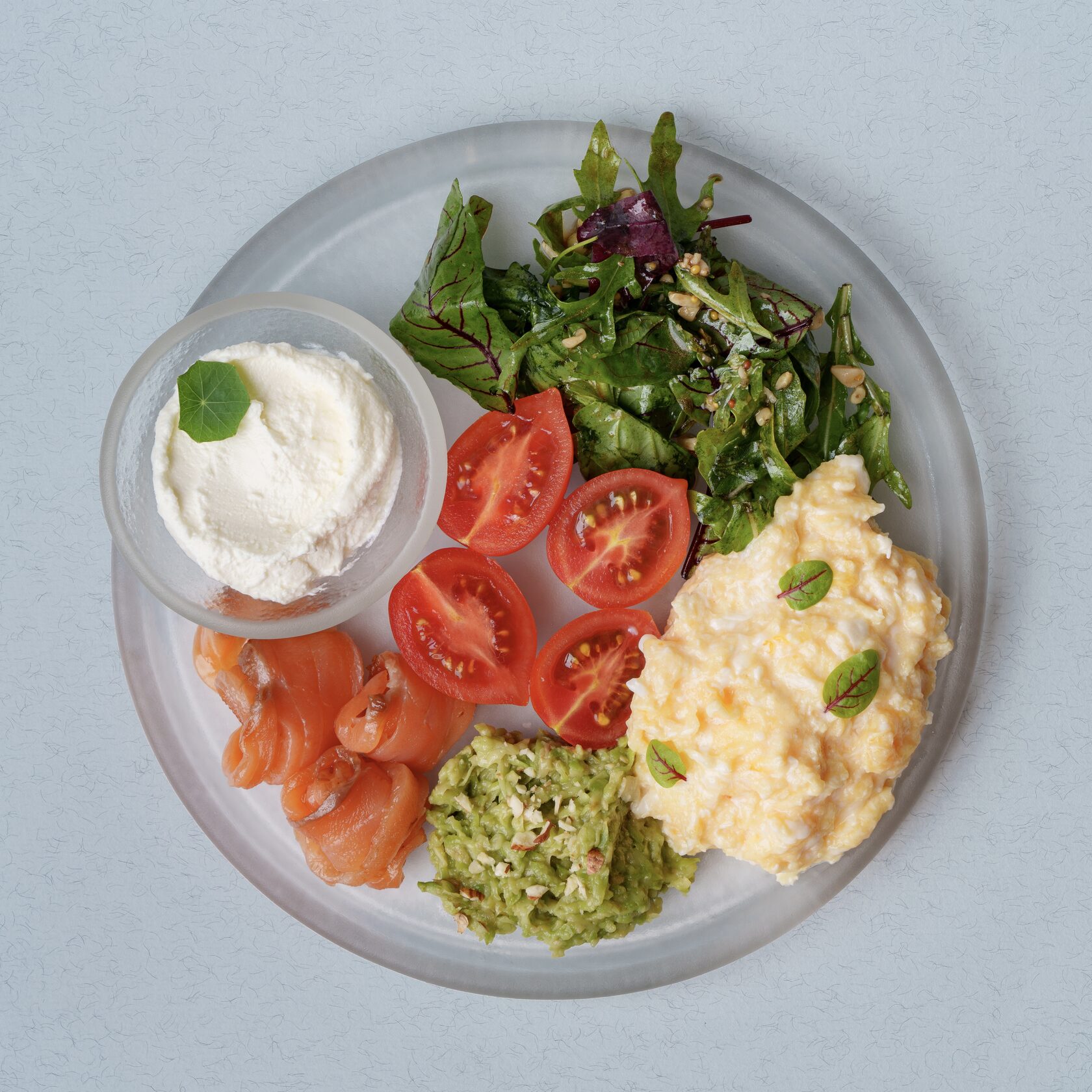 Слабосоленый лосось, скрэмбл, сливочный сыр, томаты черри, гуакамоле и микс-салат.